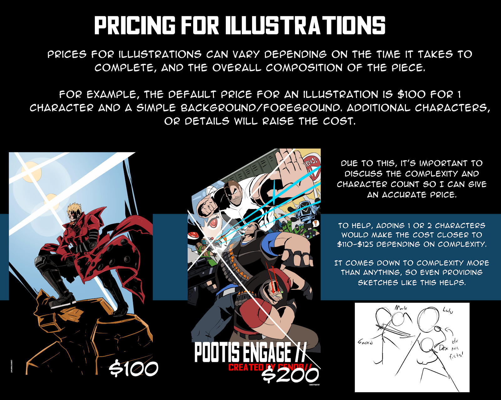 --If it is needed by a certain deadline, please included either a solid deadline, or estimation of when you the project done by.-Payments made via Paypal Invoices-Commission Requests will be accepted and/or denied for any reason whether it is for time, content, etc.-Multiple pieces can be done. (Example: Multiple Ref Sheets, Multiple Eyecatches, mix matches with Refs, Eyecatches, Covers, as well as Covers and Panel Work, etc.)-If any other questions are needed for Quotes, Piece info, jobs not listed here, etc., please include it in the mail body.