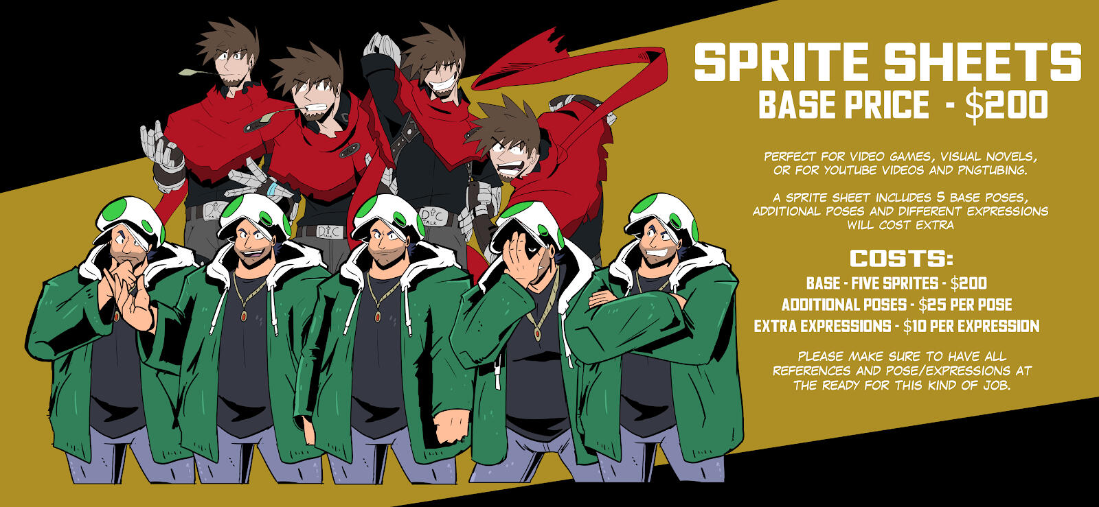 -Multiple pieces can be done. (Example: Multiple Ref Sheets, Multiple Eyecatches, mix matches with Refs, Eyecatches, Covers, as well as Covers and Panel Work, etc.)-If any other questions are needed for Quotes, Piece info, jobs not listed here, etc., please include it in the mail body.